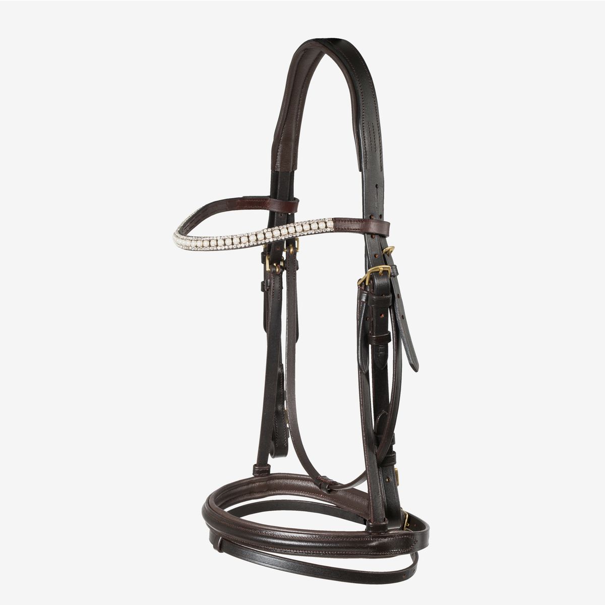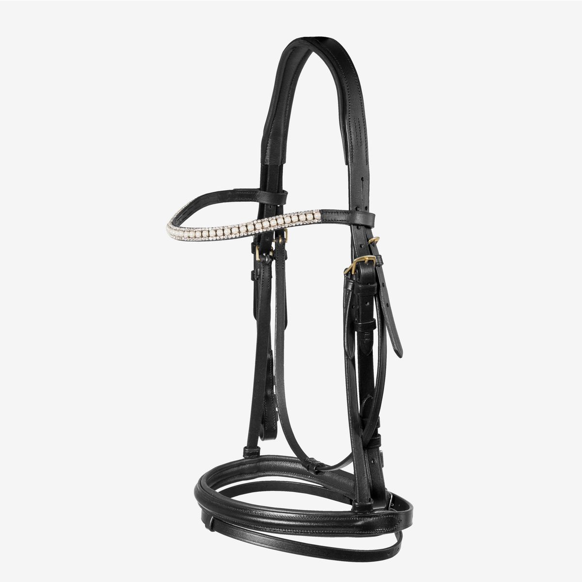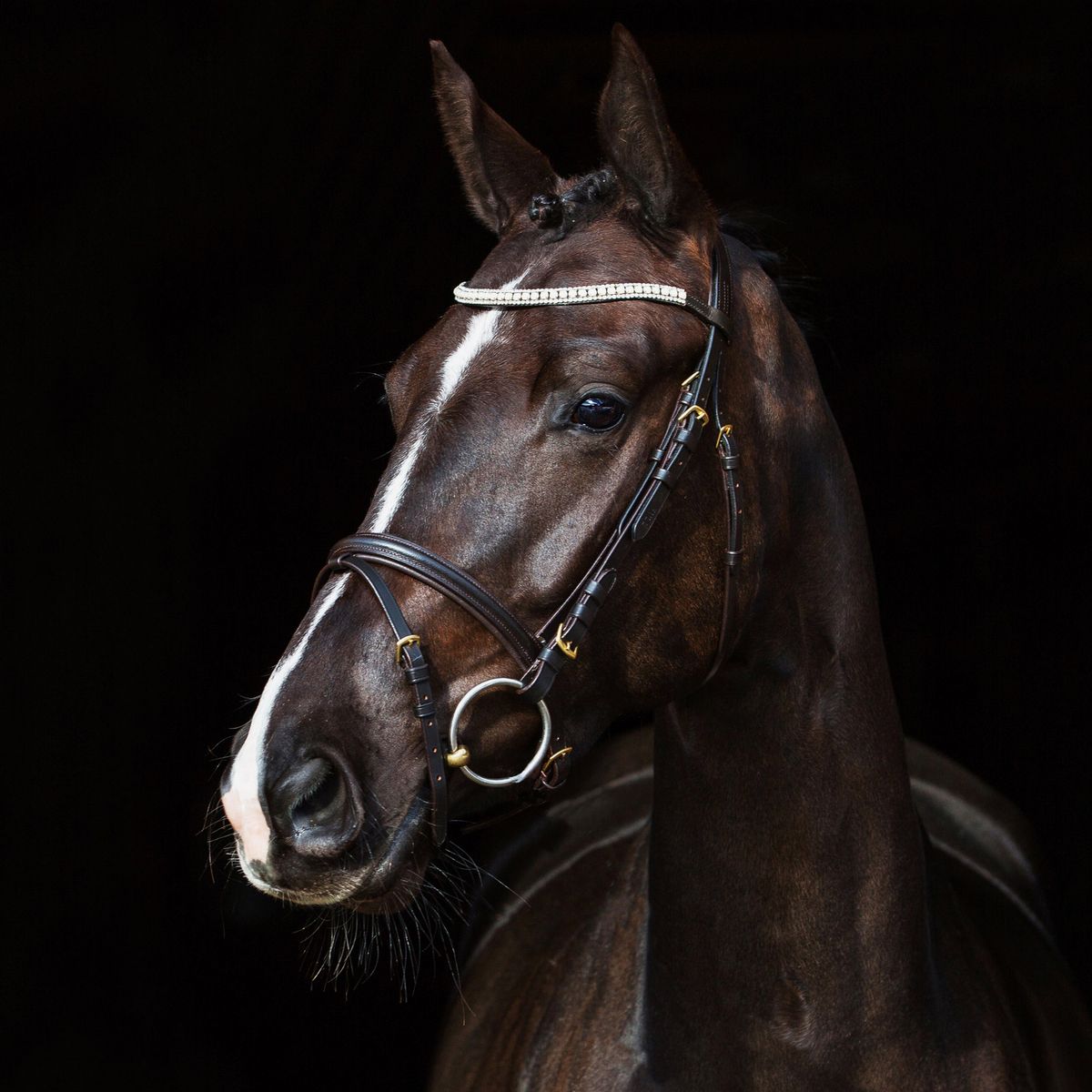 Klasyczne skórzane ogłowie od Horze, którego elegancki klasyczny design przełamany został przyciągającym wzrok, pięknym naczółkiem z perełkami.