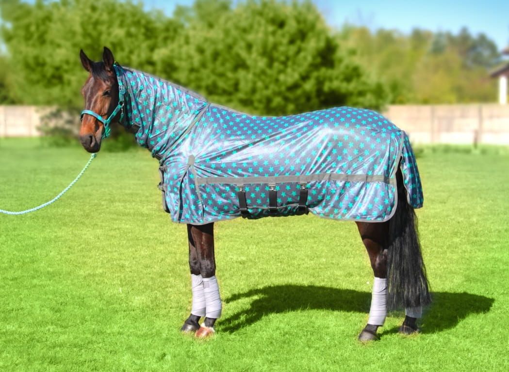 Kaptur oraz szeroki pas pod brzuchem zapewniają dodatkową ochronę przed uciążliwymi owadami