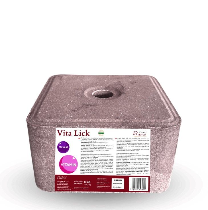 Bardzo smaczna lizawka solna, której skład został wzbogacony o witaminy i minerały. Produkt stanowi zdrowe uzupełnienie diety, idealne dla każdego konia bez względu na wiek oraz rodzaj wykonywanej aktywności fizycznej. Dodatkowo Vita Lick dostarcza składniki, które są szczególnie ważne dla zachowania równowagi elektrolitowej koni, co jest bardzo ważne dla utrzymania zdrowia i dobrej kondycji.