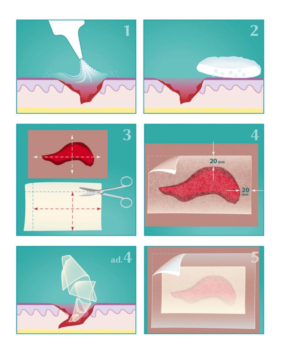 • Osuszyć skórę dookoła rany, lecz lekko zwilżyć samo łożysko rany.