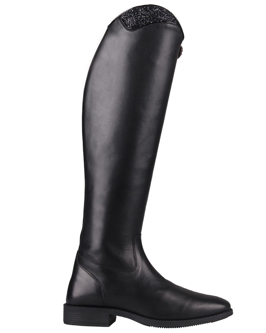 Skórzane ujeżdżeniowe oficerki z brokatowym akcentem i lamówką z lakierowanej skóry.